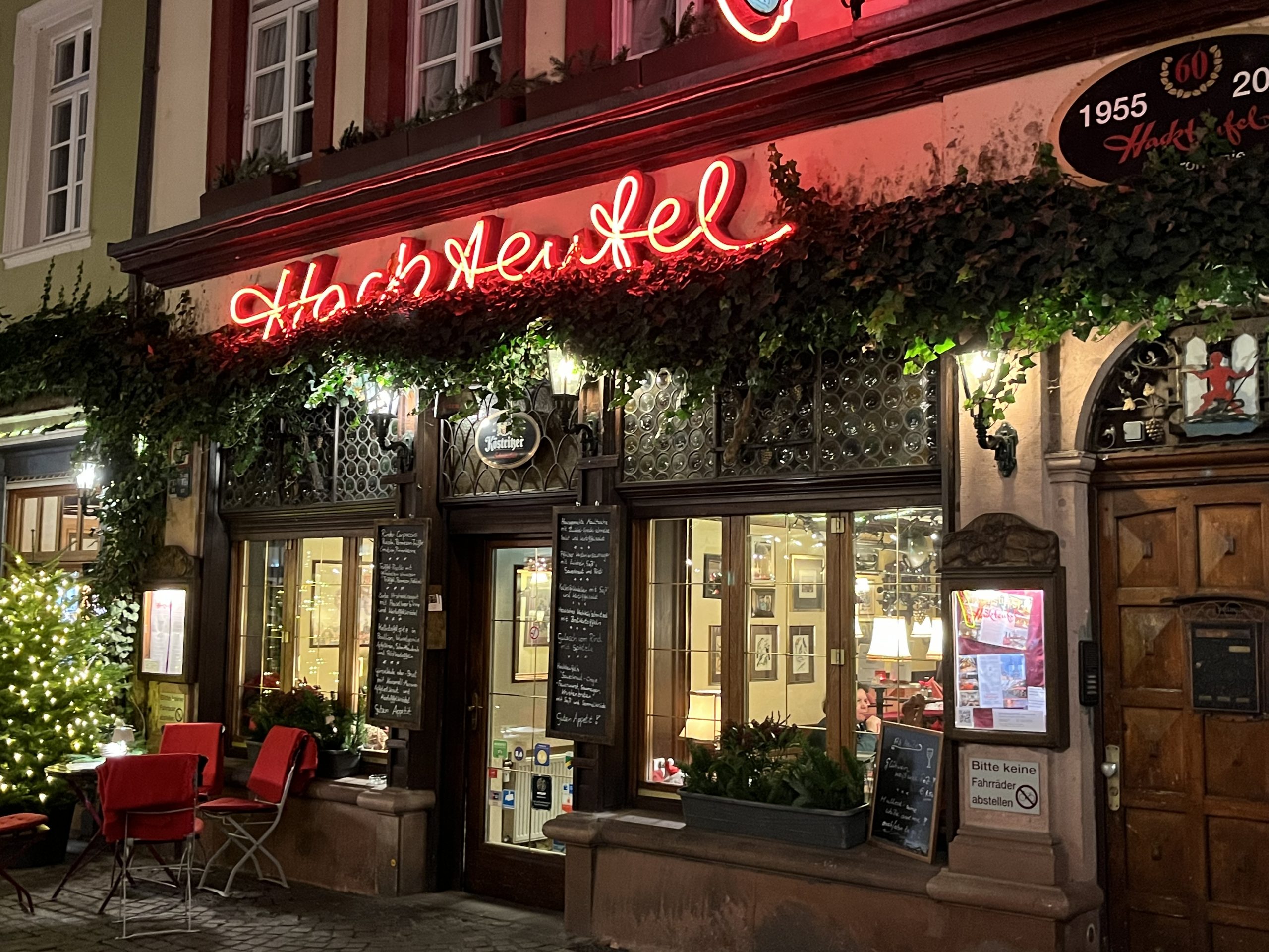 Ich war letzte Woche in Heidelberg, beruflich unterwegs. Nach der Arbeit blieb stets ein Rest von Unruhe in mir: eine Mischung aus geistigem Angeregt-Sein und leichter Übermüdung; Städte wie Heidelberg verstärken das noch. Und so landete ich – beinahe automatisch – im «Hackteufel». Ein kleines Gasthaus, einen Schritt entfernt von der Heiliggeistkirche, eingespannt zwischen Touristenströmen und studentischer Gewohnheit, fast direkt am Neckar gelegen. Und dort, in der Fensterecke, ein unscheinbarer Tisch, an der Wand ein Porträtbild von Hans-Georg Gadamer und der Hinweis: Stammplatz des «lebendigen Geistes». Per Zufall kam ich darunter zu sitzen.